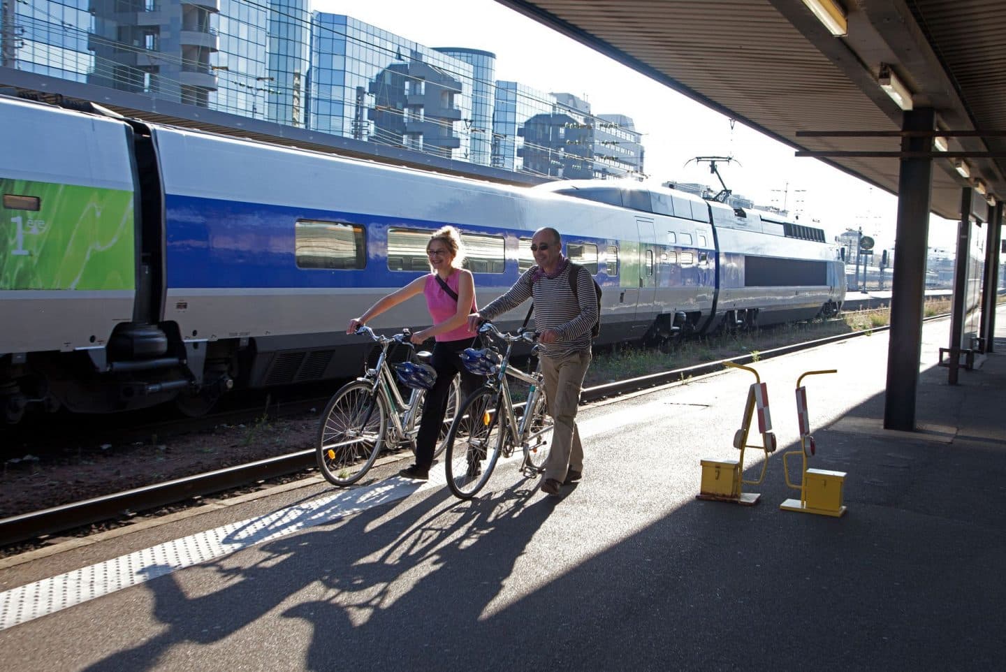 • Couple de cyclotouristes devant un TGV, à la gare de Tours © P.Forget - CRT Centre-Val de Loire