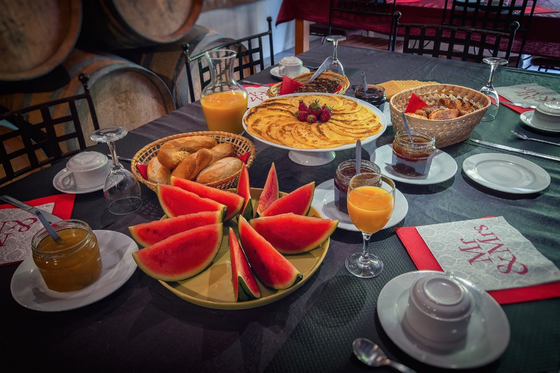 Het ontbijt wordt geserveerd in de oude wijnperskamer, of zelfs in vaten, en is samengesteld uit verse, zelfgemaakte producten of producten die geselecteerd zijn op hun kwaliteit.